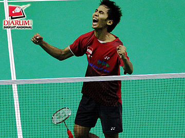 Ekspresi kemenangan Alamsyah Yunus (Pertamina Indonesia) setelah mengalahkan Arief Gifar Ramadhan (Pelatnasi PBSI) dengan skor akhir 21-16
