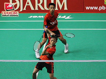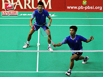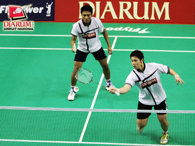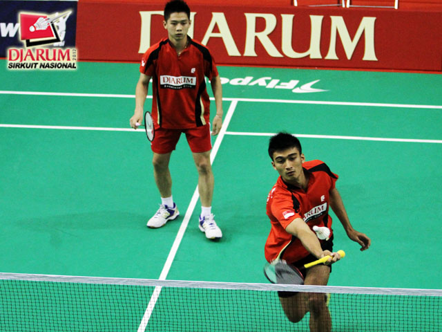 Henry Jansen Putra Wibowo yang berpasangan dengan Rifki Nur Alam (Djarum Kudus) sedang mengembalikan kok kepada pasangan M Fachrikar/ Reza Pahlevi (Jaya Raya Jakarta).