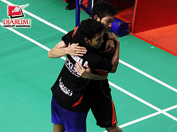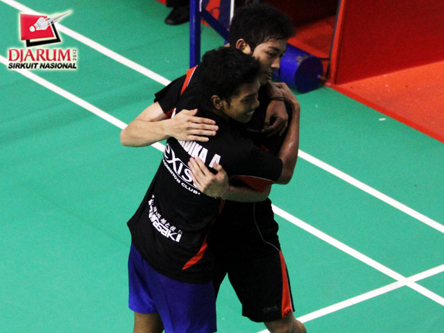 Pasangan Alwi Mahardika/ Asnan Mahardika dari Klub Exist saling berpelukan setelah menang atas Achmad Fasich (Citra Raya Unesa) / Ragawa Tamasuta (Semen Gresik) dengan skor akhir 23-21.