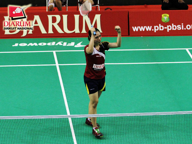 Ekspresi kemenangan Febby Angguni dari Djarum Kudus atas Hera Desi Ana Rachmawati (Pelatnas PBSI). Febby Angguni berhasil mengalahkan Hera Desi Ana Rachmawati dengan skor akhir 21-17.