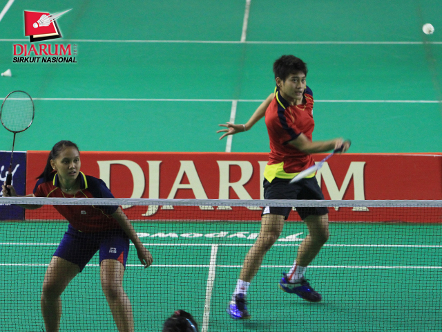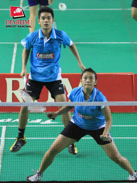 Pasangan Ganda Taruna Campuran asal Mutiara Bandung, Mareta Dea Giovani (depan) yang berpasangan dengan Bagus Haryanto (belakang) sedang bersiap-siap memukul kok.