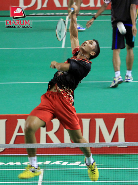 Gestano Ganendra asal Tangkas Alfamart sedang memukul kok dalam pertandingan melawan Toni asal Rosobin.