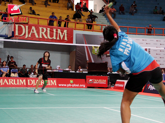 Nindi Octaviani (PPLP DKI Jakarta) Saat Menangkis Shuttle Cock yang Diberikan oleh Marsa Indah Salsabila (Djarum Kudus)