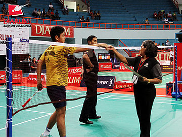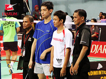 Halim Dana Perdana (AKLI BC Pare-Pare) dan Willson Mattew R Berfoto Bersama Para Wasit Sebelum Memulai Pertandingan