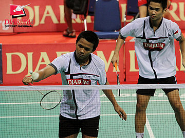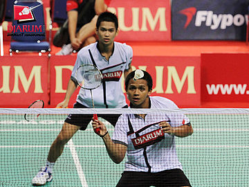 Rendra Wijaya/Rian Sukmawan (Djarum Kudus) berusaha mengembalikan kok ke arah pasangan Aswan Wawan/Kristian Gosai (Avanti Makassar)