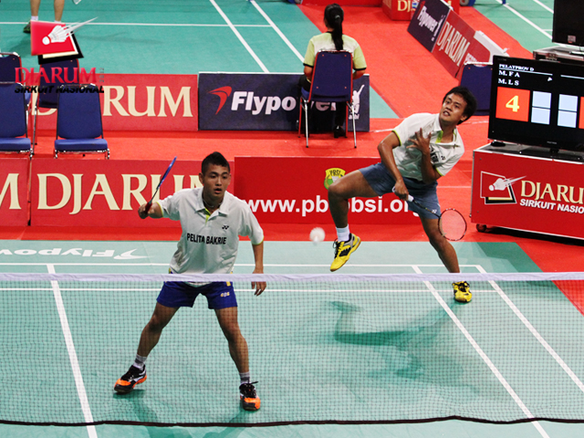 Pasangan Abu Bakar/Kevin Esra (Djarum Kudus) berusaha mengembalikan kok ke arah pasangan M.Fadly Anshor/M.Lutfi Syaiful (Pelatprov DKI)