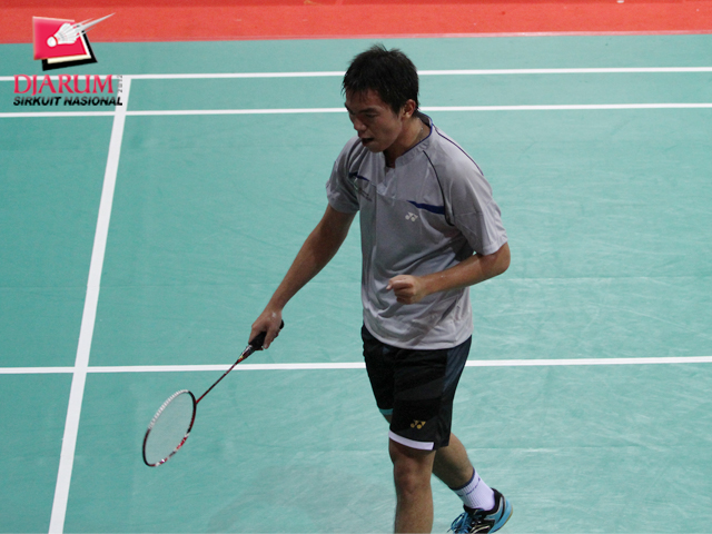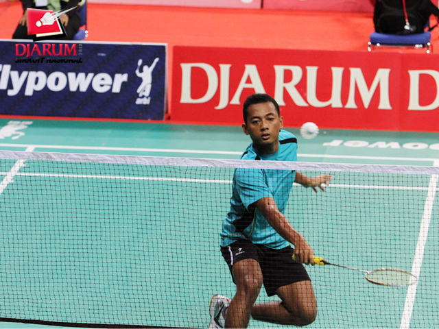 Jeffer Rosobin (Rosobin Jakarta) berhadapan kontra M. Junaedi (Pelabuhan II) di babak pertama tunggal putra Djarum Sirkuit Nasional Sulawesi Selatan Open 2012.