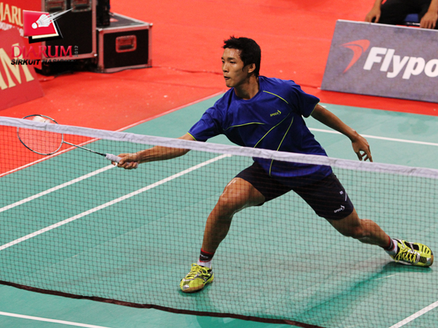Jonathan Christie (Tangkas Alfamart Jakarta) berusaha mengembalikan kok ke arah Muh.Erwin (Arena Spirit Cirebon).