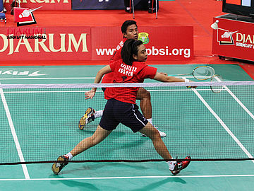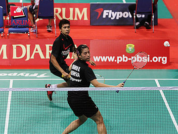 Pemain PB Djarum ,Dandi Prabudita berusaha mengembalikan kok ke arah pasangan asal SGS PLN Bandung, Andhika Anhar + Keshya Nurvita Hanadia.