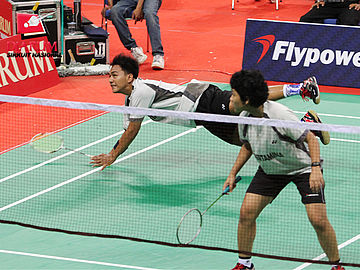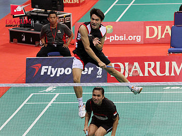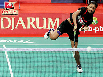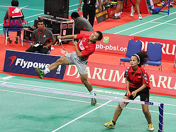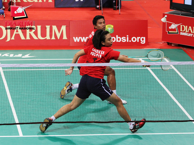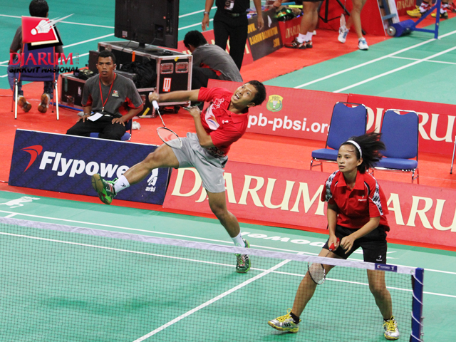 Pasangan Rendra Wijaya/Maria Elfira Christina (Djarum Kudus) melancarkan smash keras ke arah pasangan M.Nur Rofii + Aris Budiarti (Pusdiklat Jaya Raya Jakarta)