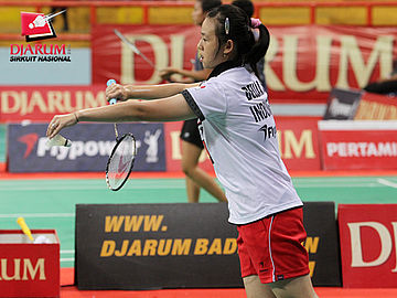 Pemain PB Djarum, Della Agustia Surya melakukan service ketika berhadapan kontra pasangan Rizko Assuro/Lya Ersalita (Guna Dharma/ Pusdiklat Jaya Raya)