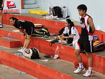 Pasangan Moh.Asyukru/Siti Mahiroh (Pelabuhan II) berusaha mengembalikan kok ke arah pasangan Indra Setiawan + Sarah Safitri (Pertamina).