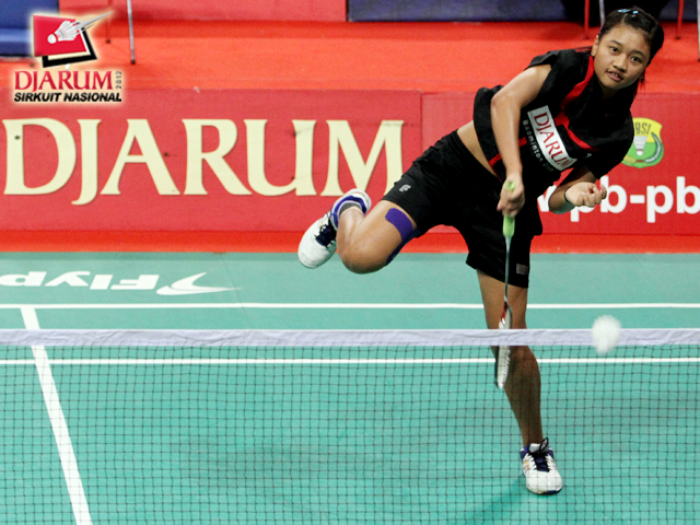 Aida Arum Amanah (Djarum Kudus) berusaha mengembalikan kok ke arah Indah Yuliani Ismail (Akli BC Pare-Pare)