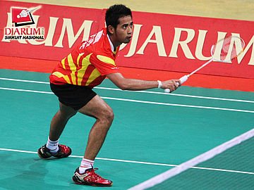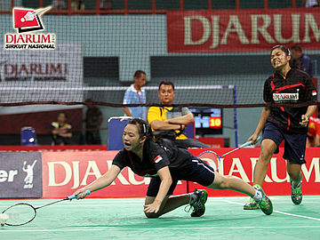 Pasangan Arsya Isnanu Ardi Putra/Hantoro (Djarum Kudus) berusaha mengembalikan kok ke arah pasangan R.E.F/Rian S (Pusdiklat Jaya Raya)