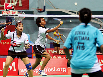 Pasangan Vita Marissa/Nadya Melati (Tangkas Alfamart Jakarta) berusaha mengembalikan kok ke arah pasangan Sri Wulansari/Eri Oktaviani (Pusdiklat Jaya Raya)