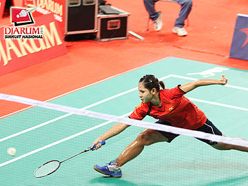 Rusyidina Antardayu (Tangkas Alfamart Jakarta) berusaha mengembalikan kok ke arah Rizky Amelia (Pusdiklat Raya Jakarta)