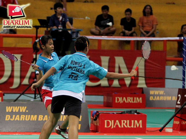 Pasangan Chintia Rhizta Andreti/Jessica Shoham (PB Djarum) berusaha mengembalikan kok ke arah pasangan Monica Angilu/Suci Ramadhani (Mutiara Bandung)