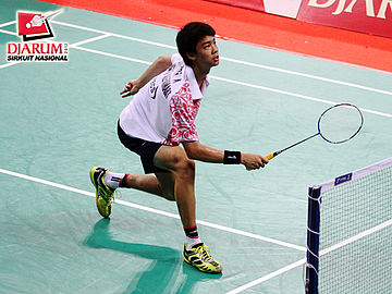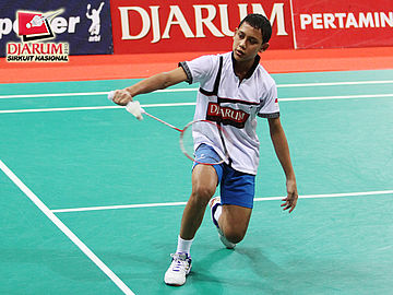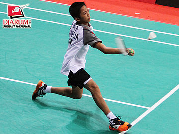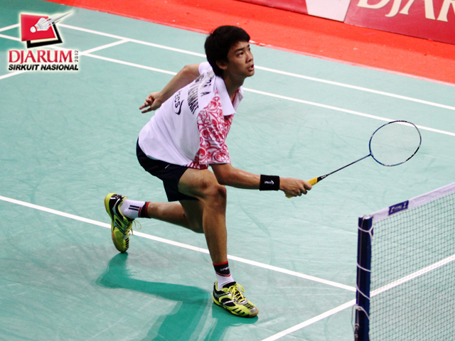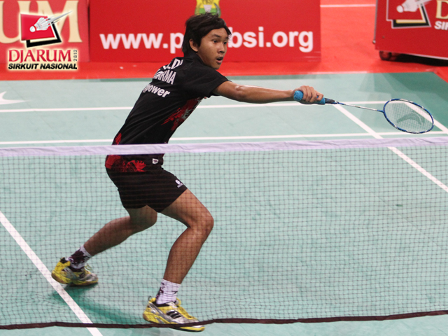 Dheva Anri Musthi (SCW Medan) berusaha mengembalikan kok ke arah Fauzi Ramadhan (Djarum Kudus)