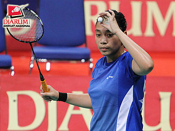 Pia Zebadiah (Pusdiklat jaya Raya Jakarta) berusaha mengembalikan kok ke arah Novalia Agustianti (Tangkas Alfamart Jakarta)