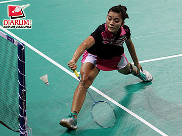 Novalia Agustianti (Tangkas Alfamart Jakarta) berusaha mengembalikan kok ke arah Pia Zebadiah (Pusdiklat jaya Raya Jakarta)
