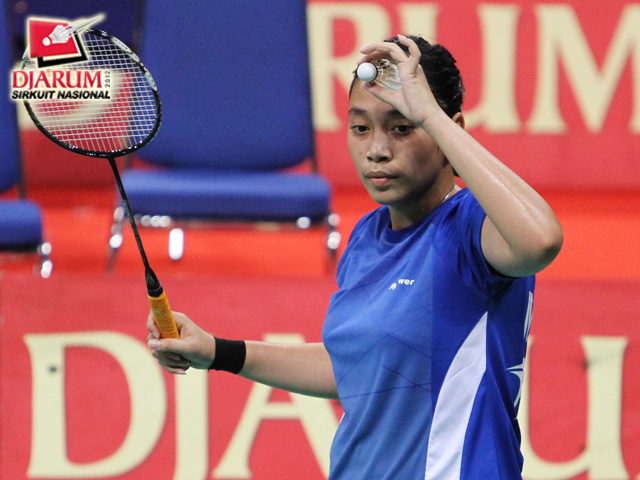 Pia Zebadiah (Pusdiklat Jaya Raya Jakarta) berusaha mengembalikan kok ke arah Novalia Agustianti (Tangkas Alfamart Jakarta)