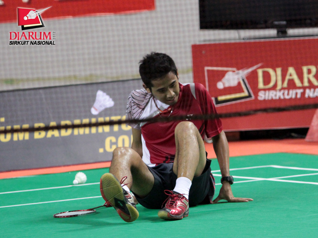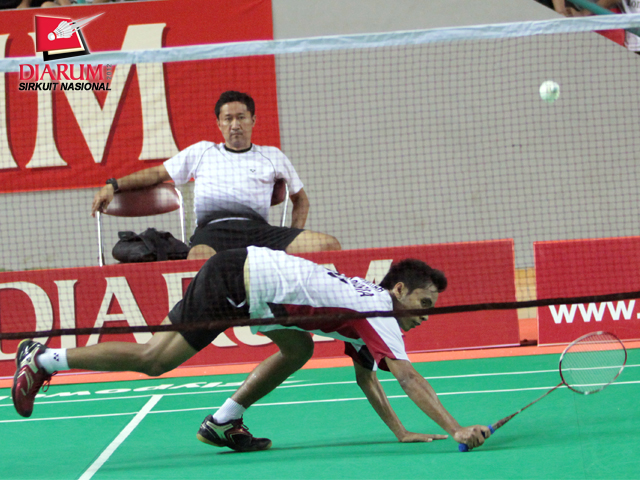 Alamsyah, pemain Pertamina Indonesia terpeleset saat mengembalikan bola dari Andreas Adityawarman, pemain PB Djarum dalam pertandingan Tunggal Dewasa Putra ronde ketiga yang berlangsung Kamis, (22/3).