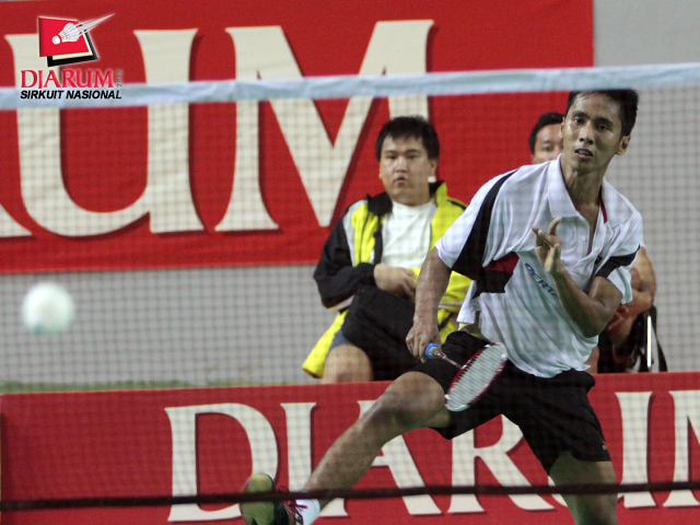 Pemain Pertamina Indonesia, Alamsyah Yunus yang menjadi unggulan pertama Tunggal Dewasa Putra sedang melakukan smash ke arah lawannya, Adityawarman dari PB Djarum. Alamsyah memenangkan pertandingan dengan perolehan skor 21-13/21-19.