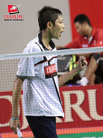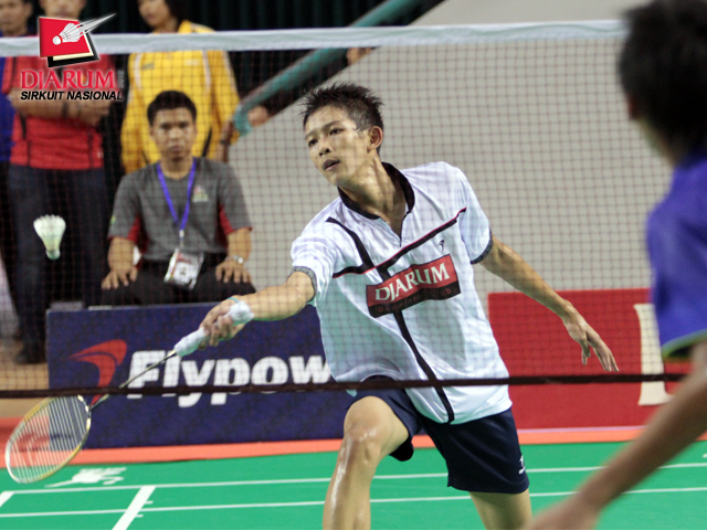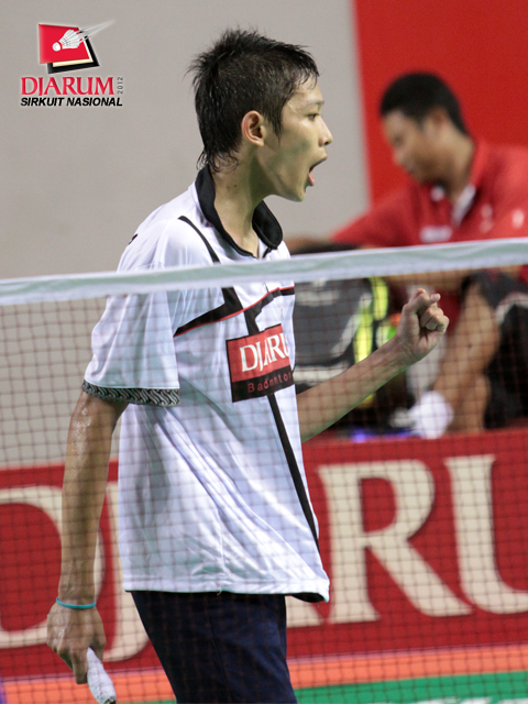 Ekspresi kepuasan M. Bayu Pangisthu dari PB Djarum saat berhasil mencetak poin dalam pertandingan melawan Hariawan Suyitno Surya dari Surya Baja.