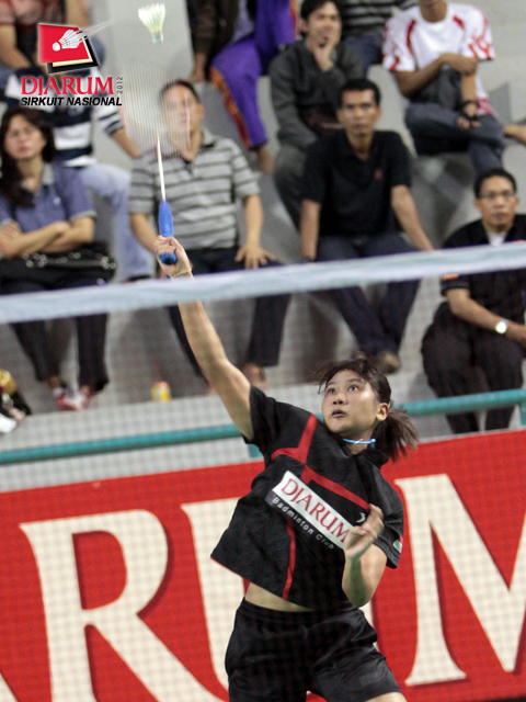 Rena Asela, pemain Tunggal Taruna Putri PB Djarum sedang memperhatikan arah jatuhnya bola dalam laga pertandingan melawan Rini Andriani dari Mutiara Bandung.