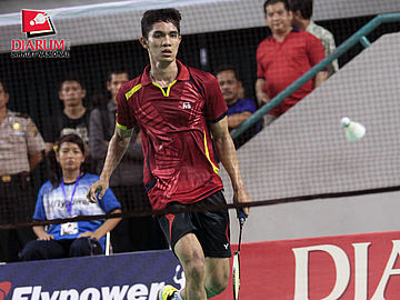 Yogi Irvans (Angkasa Prestasi Gemilang) nampak kecewa saat kok-nya gagal melewati net. Dalam pertandingan melawan Ahmad Rivai (Bank Sumsel Babel) tersebut, Yogi kalah 10-21 dan 14-21 dari Ahmad Rivai.
