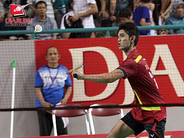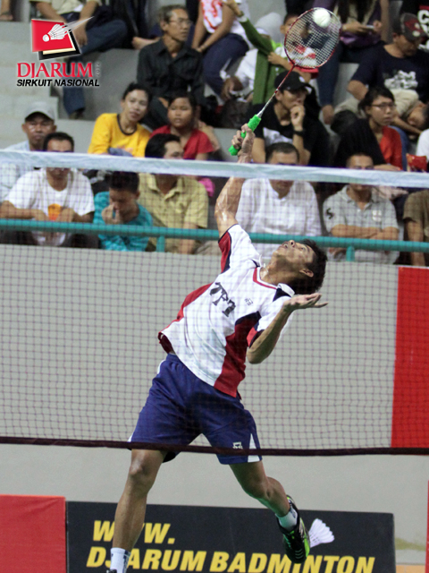 Pemain Jaya Raya Suryanaga Fauzi Adnan melakukan smash dalam pertandingan melawan Bandar Sigit Pamungkas dari PB Djarum. Fauzi menang 21-9 dan 21-11 dari Bandar.