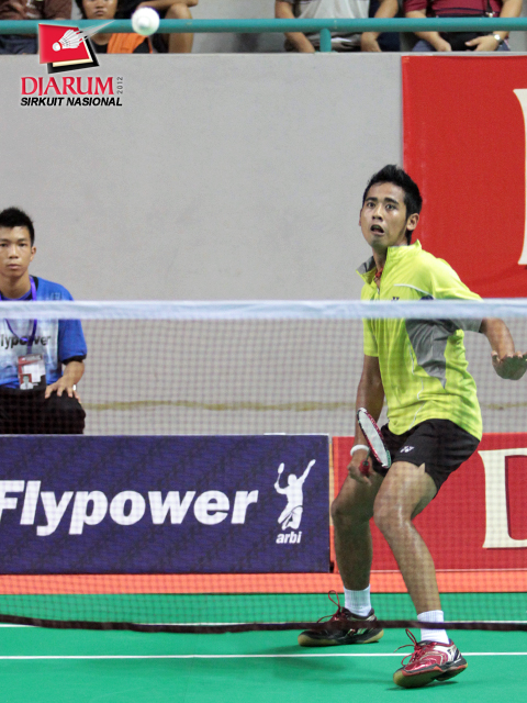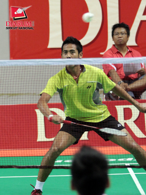 Hermansyah asal Jaya Raya Jakarta sedang fokus mengamati arah datangnya kok dari Alamsyah asal Pertamina Indonesia dalam pertandingan babak perempat final Tunggal Dewasa Putra.