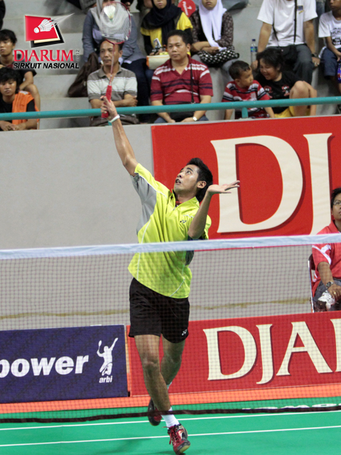 Hermansyah, pemain asal Jaya Raya Jakarta sedang memukul kok saat bertanding melawan Alamsyah dari Pertamina Indonesia di babak perempat final.