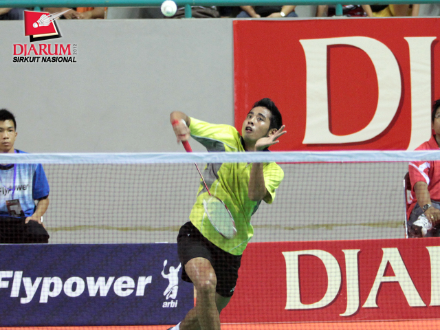 Pemain Tunggal Taruna Putra asal PB Djarum, Ikhsan Maulana sedang melakukan smash dalam pertandingan melawan Muhammad Nizar dari Pelatprov DKI.