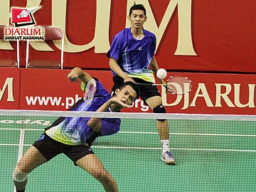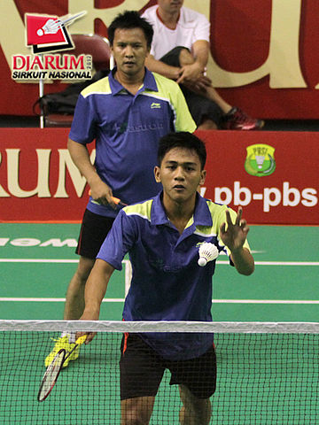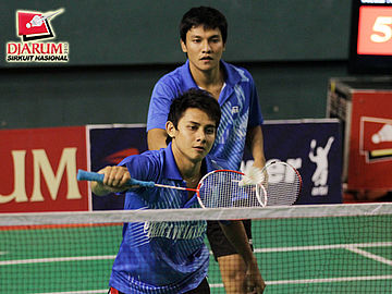 Danu/Indra Setiawan (Pertamina Indonesia) melakukan serve.