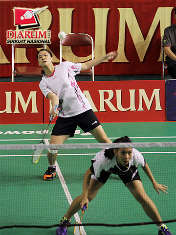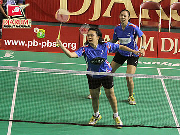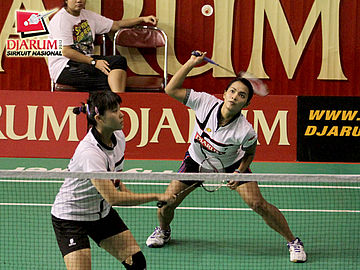 Pasangan Deariska Putri/Khaeriah Rosmini (Pelatnas) berusaha mengembalikan bola ke arah pasangan Anisa Wahyuni/Yayu Rahayu (PB Djarum Kudus).