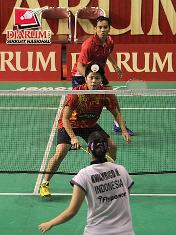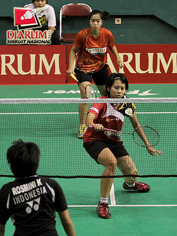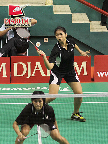 Nadia Melati/Natalia Poluakan (Pertamina Indonesia/Tangkas Specs) bersiap menyambut serve dari pasangan Nurbeta Kwanrico/Aulia Putri (PB Djarum Kudus).