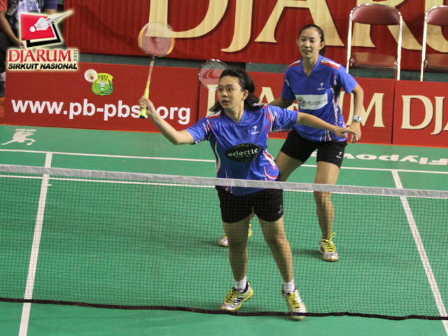 Pasangan Nurbeta Kwanrico/Aulia Putri (PB Djarum Kudus) menyambut serangan yang dilepaskan Nadia Melati/Natalia Poluakan (Pertamina Indonesia/Tangkas Specs).