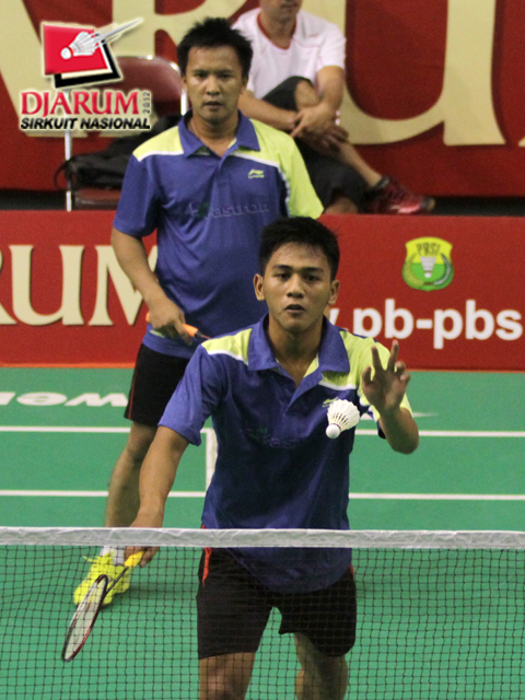 Andro Septian/Reza Aditya (Pusdiklat Pikiran Rakyat) menyambut serve dari pasangan Lulus/Santoso (HB Putra).