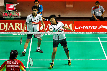 Ragawa Tamasuta/Berliyan Suderajat (Semen Gresik) mengembalikan shuttlecock ke arah Altof Baariq/Jovita Evania (Mutiara Bandung).