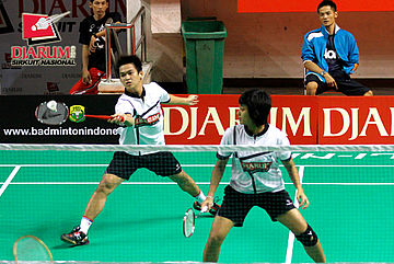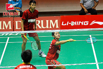 Eka Fajar (Jaya Raya) mengembalikan shuttlecock ke arah Bobby Alexander (SGS PLN).