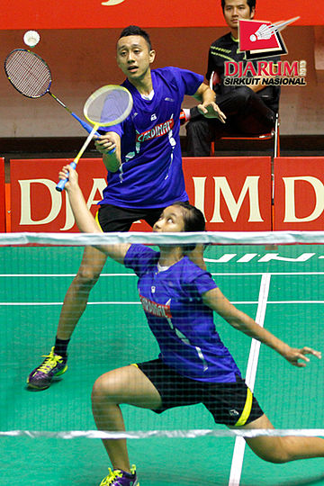 Abu Bakar/Ravenska Cintya (PB Djarum) menyambar serve dari Govinda/Michelle Tania (PBSI Denpasar/Jaya Raya Suryanaga).