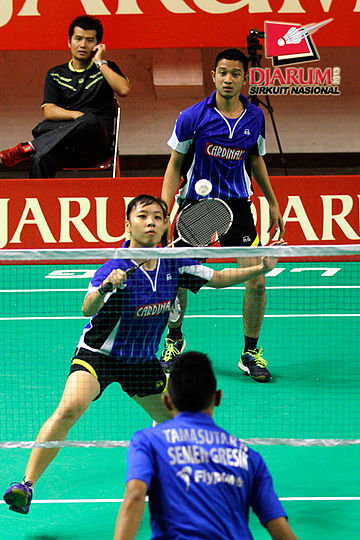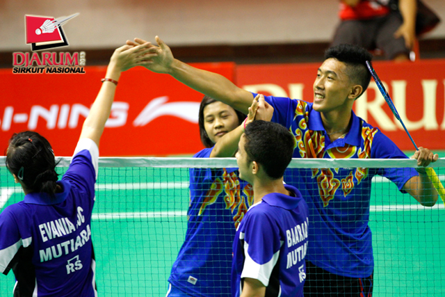 Egy/Inten Ratnasari (SGS PLN) mengembalikan shuttlecock ke arah Rafli Rizki/Novalita Anggraeni (Mutiara Bandung).