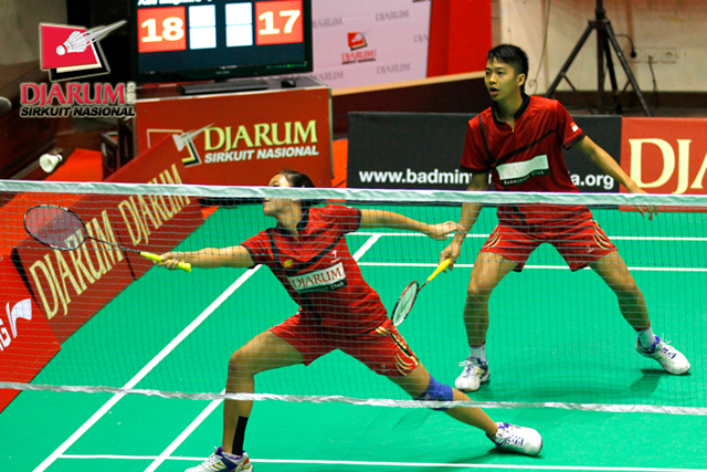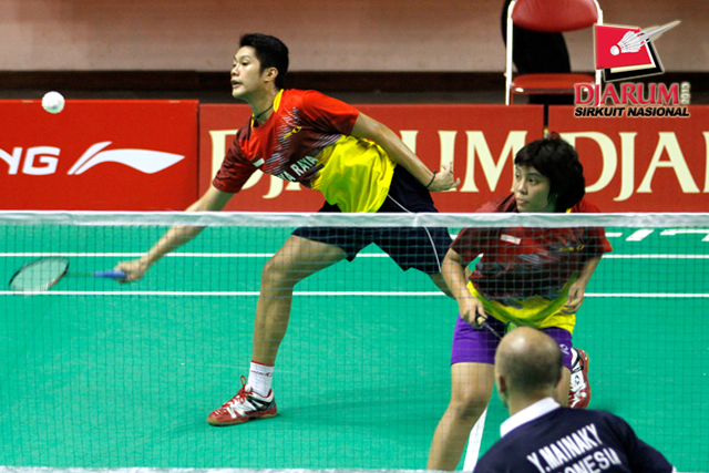Abu Bakar/Ravenska Cintya (PB Djarum) mengembalikan shuttlecock ke arah Govinda/Michelle Tania (PBSI Denpasar/Jaya Raya Suryanaga).