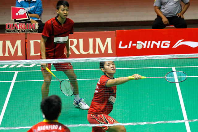 Ricky Alverino/Jessica Shohan (PB Djarum) mengembalikan shuttlecock ke arah Reynaldi/Ade Maghfiro (Hi Qua Wima/Jaya Raya).