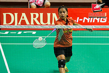 Rifa Putri Aida (PB Djarum) melepaskan serve.