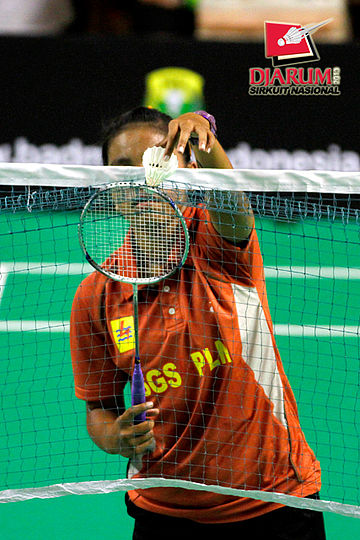 Dina Rahayu (SGS PLN) mengambil shuttlecock yang tersangkut di net.