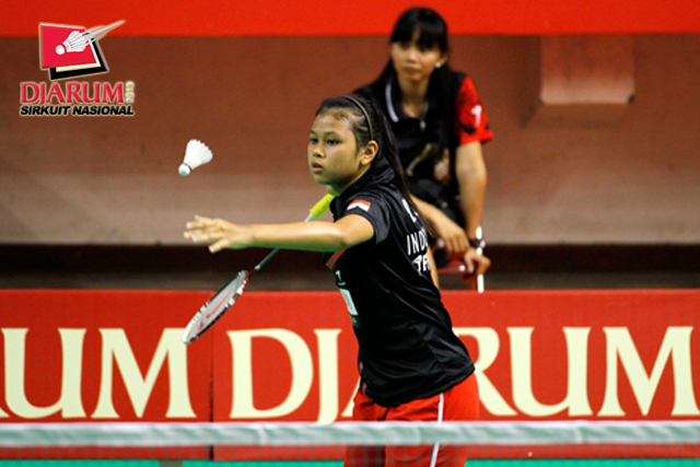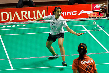 Monica Sandia (Focus Badminton) mengembalikan shuttlecock ke arah Dina Rahayu (SGS PLN).