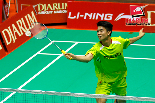 Alvindo Saputra (Tangkas Specs) menyambar pengembalian tanggung I Ketut Arya (PBSI Buleleng).