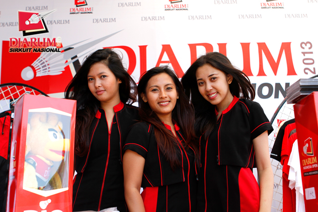 Tiga usher Djarum Sirkuit Nasional Li-Ning Bali Open 2013 berpose di booth Djarum.